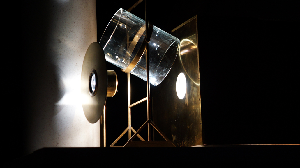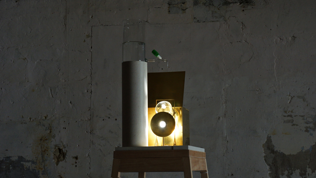 Du sablier, nous passons à la clepsydre, ou horloge à eau, qui devient ici une lanterne, et la traduction physique de son tempo est projetée grâce à une construction architecturale qui imite les premiers efforts d’urbanisation. Temple, tour, place, tous construits par l’homme pour célébrer la nature : la goutte d’eau.