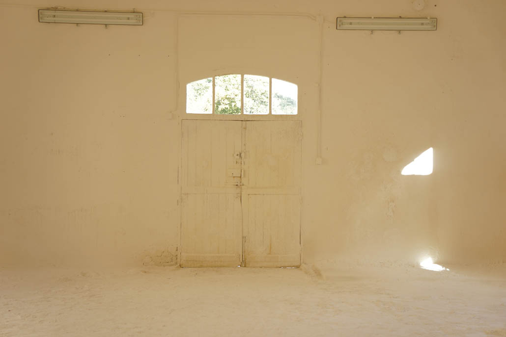 - Simon Boudvin, TECTOEDRES 02 (SEMT-Saint-Denis), 2012, poussière de gravats, collectée et tamisée sur le site de SEMT-Pielstick à Saint-Denis, saupoudrée sur les plaques reproduisant les parcelles au 1:100.